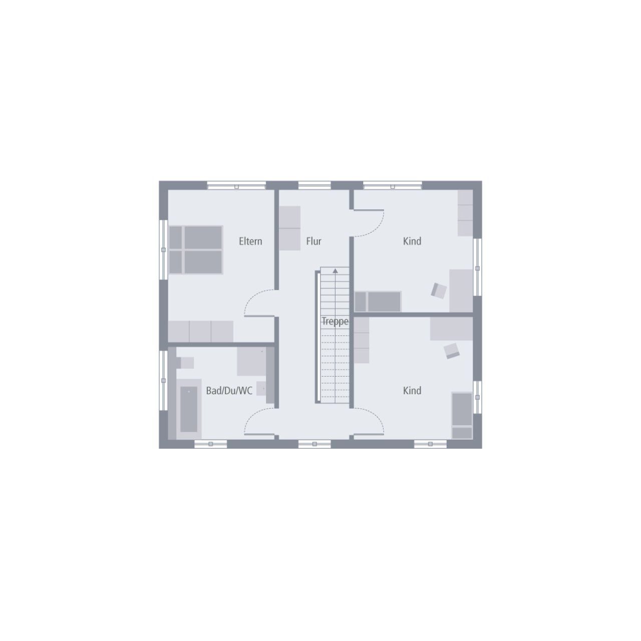 Ein Walmdach, das verkörpert Eleganz und vermittelt einen edlen, fast schon herrschaftlichen Eindruck. So auch bei unserer Stadtvilla 10 mit Walmdach. Das große Plus: Dank dieser Dachform gibt es im Obergeschoss keine Dachschrägen und damit zahlreiche Möglichkeiten zum Positionieren der Möbel. Doch diese Stadtvilla kann noch mit vielen weiteren kleinen und großen Ausstattungs- und Grundrissdetails punkten. So gibt es im ca. 78 m2 großen Erdgeschoss eine räumliche Zweiteilung: die Zimmer zum Entspannen und Zusammenkommen auf der Gartenseite, die funktionellen Räume auf der, der Straße zugewandten, Seite. Konkret bedeutet das: vom großen Wohn-Ess-Koch-Bereich ist der direkte Zugang auf die Terrasse und damit ins Grüne möglich. Büro, Hauswirtschaftsraum sowie Gäste-WC sind unterdessen gegenüberliegend und unmittelbar aus der Diele zugänglich. Im Obergeschoss befinden sich neben dem Reich der Eltern zwei identisch große Kinderzimmer sowie ein geräumiges Bad mit Wanne, Dusche und WC.
