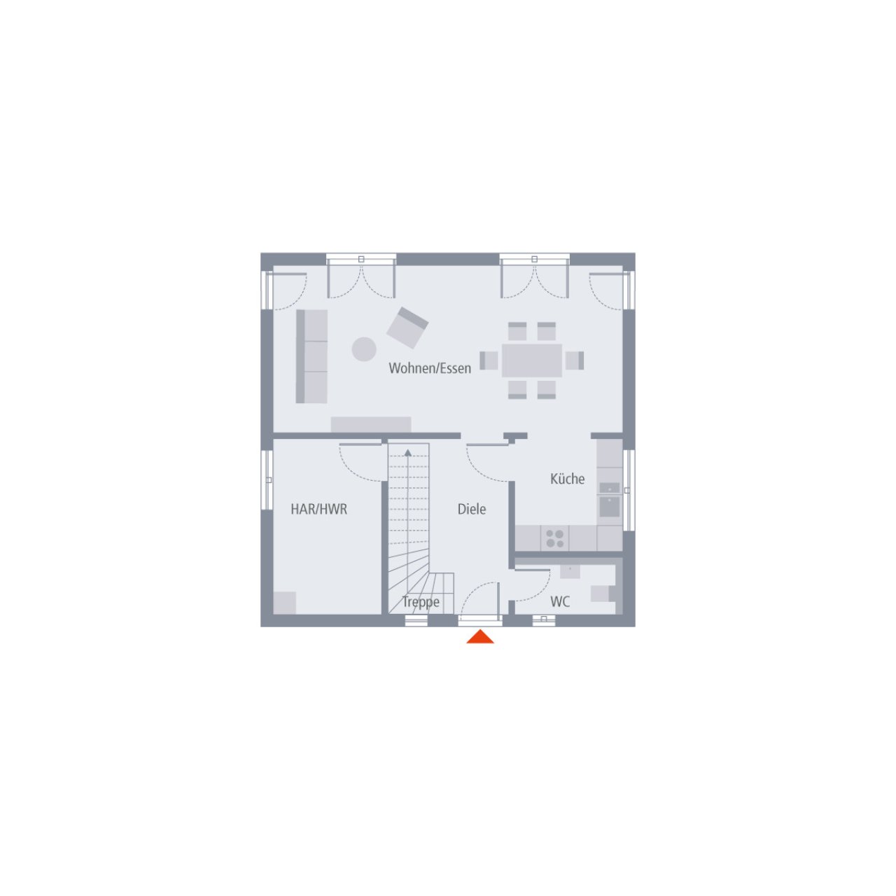 Die klassische Stadtvilla mit quadratischem Grundriss und Walmdach besticht durch klare Linien, eine geschickte Raumaufteilung und viel Lichteinfall. Im Erdgeschoss dominiert der rund 32 m2 große, komplett offene Wohn-Ess-Bereich. Zwei große Flügeltüren führen von hier in den Garten und sorgen für reichlich Tageslicht. Die zum Esszimmer hin offene Küche, ein Gäste-WC sowie der geräumige Hauswirtschaftsraum befinden sich ebenfalls auf dieser Ebene. Von der Diele führt eine Treppe in das obere Stockwerk, das zugleich Rückzugsort für Eltern und bis zu zwei Kinder ist. Neben zwei Kinderzimmern und einem Bereich für die Eltern findet sich hier ein großes Bad, in dem am Morgen auch die ganze Familie Platz findet. Auf insgesamt rund 125 m2 haben die neuen Eigenheimbesitzer hier einen Ort der Ruhe und Erholung, des Rückzugs und der Entspannung.