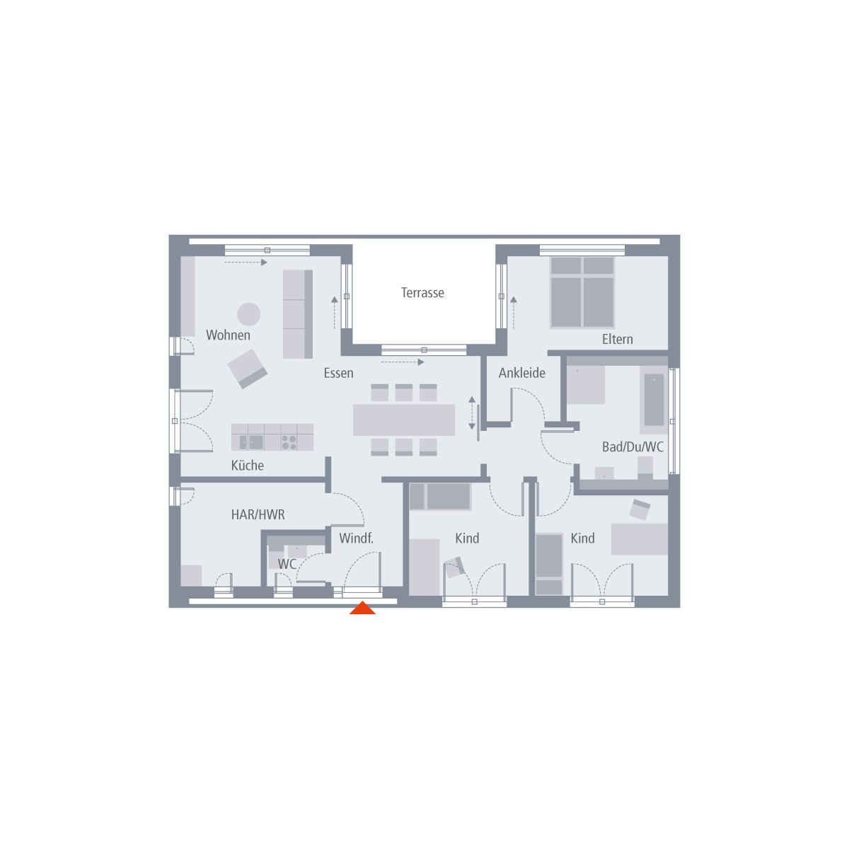 Und auch im Inneren ist der Musterhaus Bungalow bis ins kleinste Detail durchdacht. Auf einer Wohnfläche von knapp 150 Quadratmetern finden Familien mit bis zu zwei Kindern Platz. Durch die symmetrische Grundrissgestaltung mit einem Rückversatz entsteht im Außenbereich ein vor Blicken geschützter Bereich, der sich perfekt als Terrasse und damit als Rückzugsort eignet. Der Zugang ist möglich durch den großen und hellen Wohn-Essbereich mit integrierter Küche. Diese ist so konzipiert, dass das Einbinden einer Kochinsel problemlos möglich ist und als idealer Raumteiler zwischen Wohn- und Essbereich fungieren kann. Abgerundet wird das Raumangebot durch ein Eltern- sowie zwei Kinderschlafzimmer, eine großzügige Diele, ein Badezimmer mit Dusche und WC sowie durch einen großen Hauswirtschaftsraum. Ein Wohntraum für alle, die ein Zusammenleben auf einer Ebene bevorzugen und dennoch auf keinen Komfort verzichten möchten.