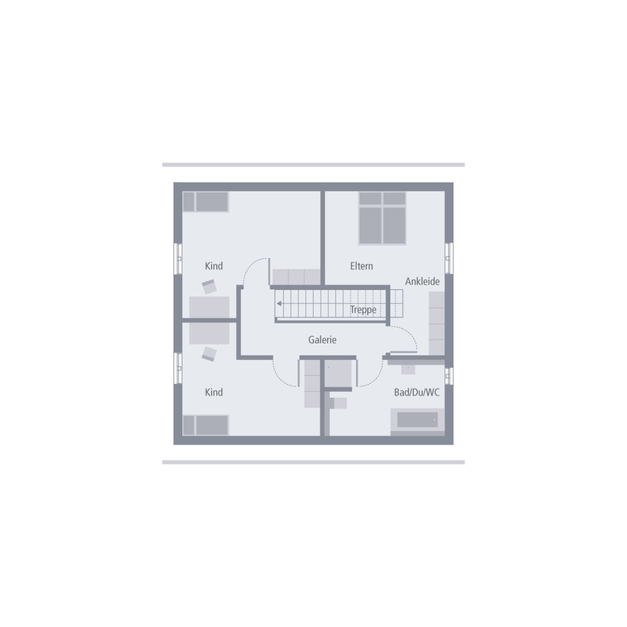 Zeitlose Eleganz außen, Weite und ein besonderes Raumgefühl innen – das ist unser Design 10. Unter dem Satteldach warten hier rund 135 m² auf zwei Ebenen darauf, bezogen und mit Leben gefüllt zu werden. Im Erdgeschoss ist Offenheit Trumpf: Hier erstreckt sich der große Wohn-Ess-Koch-Bereich nahezu über die gesamte Ebene, wird nur durch die zentral platzierte Treppe von der Diele abgetrennt. Das Ergebnis: ein lichtdurchfluteter, einladender und großzügiger Bereich zum Wohlfühlen und Treffen. Im Eingangsbereich stehen zudem ein kleines Gäste-WC sowie ein großer Hauswirtschaftsraum zur Verfügung. Über die mittig gelegene Treppe geht es ins Obergeschoss. Hier ist ausreichend Raum für Eltern und bis zu zwei Kinder. Die Eltern verfügen über ein großzügig geschnittenes Reich mit separatem Ankleideraum, zwei große Kinderzimmer lassen ebenfalls keine Wünsche offen. Abgerundet wird das Raumangebot in der oberen Etage durch ein großes Badezimmer mit Dusche, Wanne und WC.