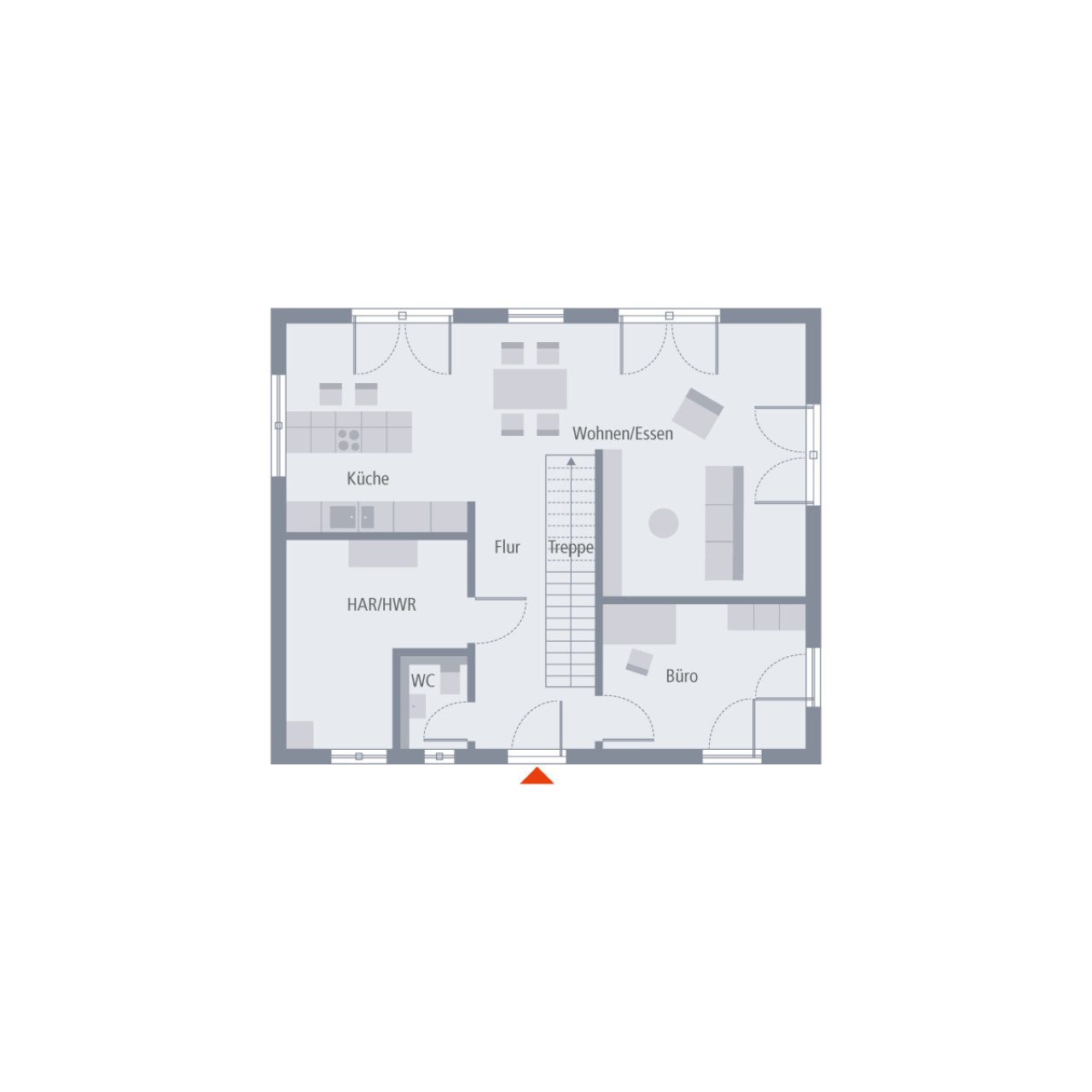 Die Stadtvilla 10 zeigt, wie modern und wohnlich ein Walmdach sein kann. Es verleiht dem Haus eine elegante Ausstrahlung – und sorgt ganz praktisch dafür, dass im Obergeschoss keine Dachschrägen den Raum begrenzen. Auf rund 78 m² im Erdgeschoss treffen Gemeinschaft und Funktionalität aufeinander: Der offene Wohn-, Ess- und Kochbereich öffnet sich zur Terrasse und holt das Grün direkt ins Haus. Büro, Hauswirtschaftsraum und Gäste-WC liegen praktisch auf der Eingangsseite. Oben finden Eltern und Kinder ihren Rückzugsort: zwei gleich große Kinderzimmer, ein großzügiges Bad und ein Elternbereich, der Ruhe ausstrahlt. Ein Zuhause mit Stil und Herz.